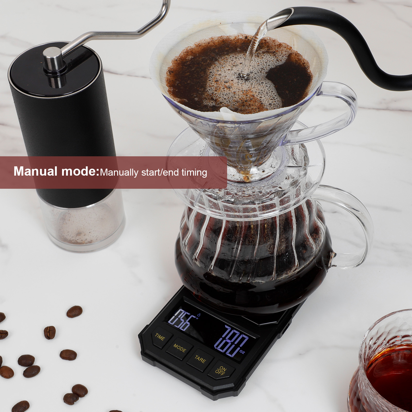 • Two modes: Manual mode: with weighing function and manual timing function. Automatic mode: The coffee scale automatically starts timing when it senses water flow and stops timing when the coffee pot is removed. It is suitable for the production process of pour-over coffee and espresso.