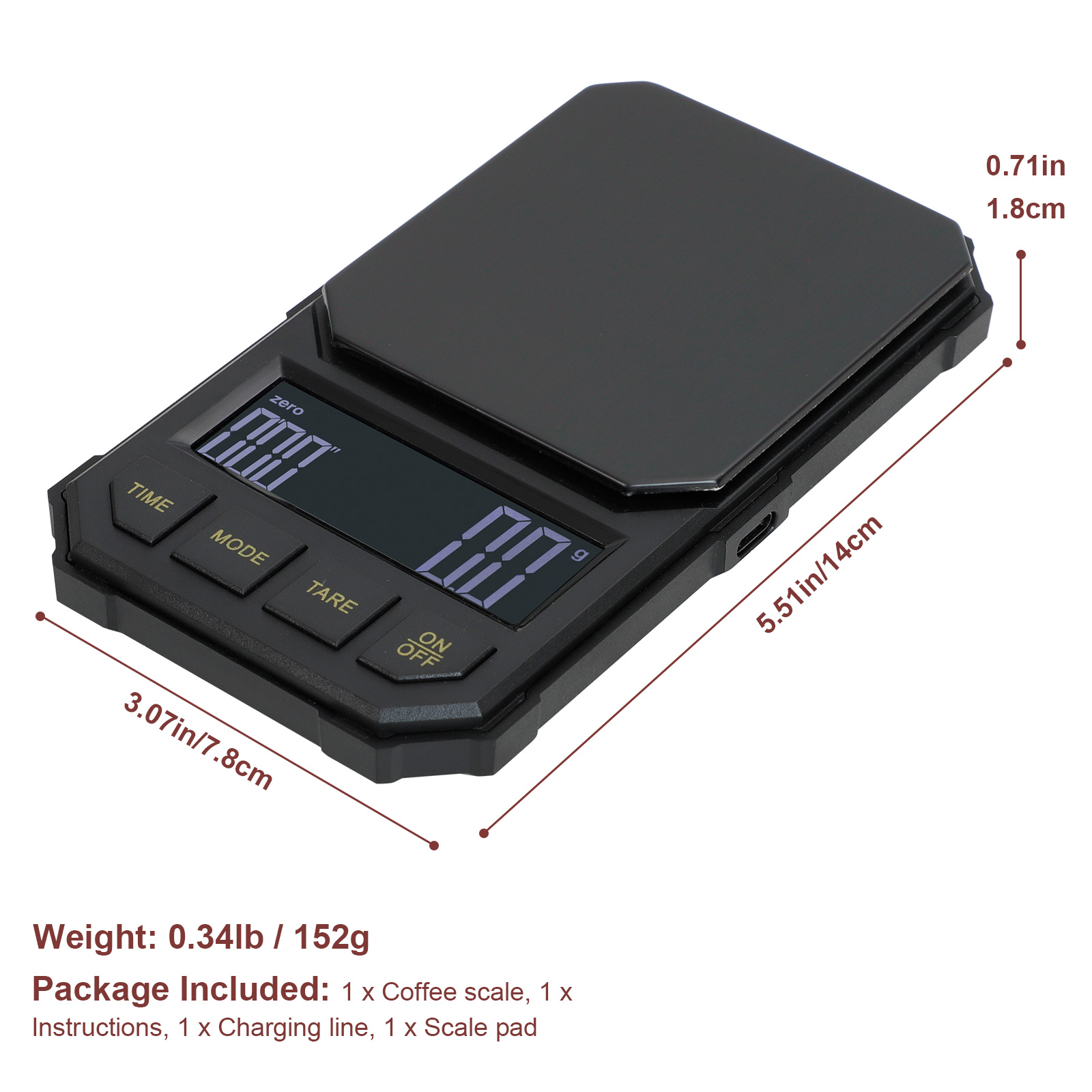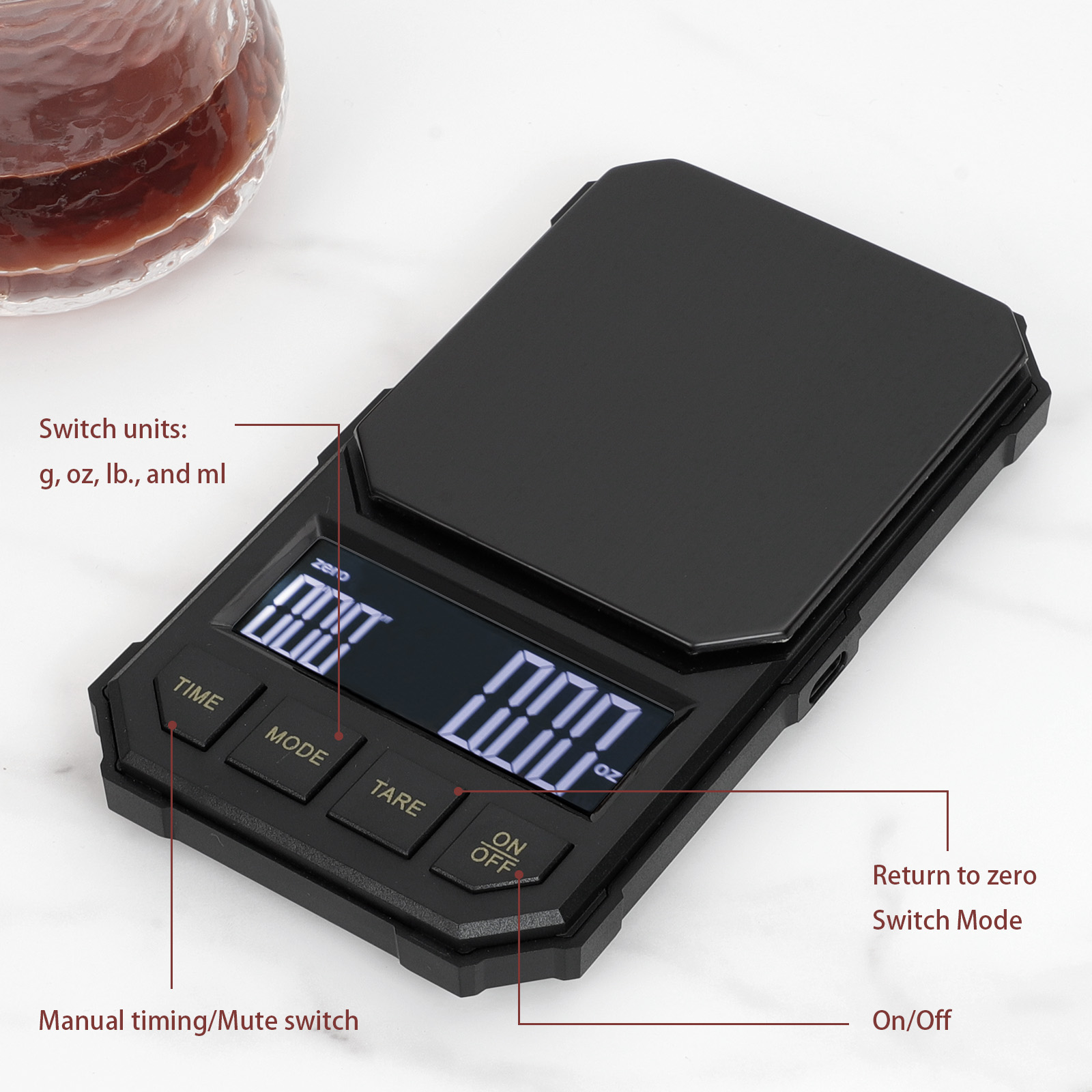 • Four units: The coffee scale has four units available for selection: g, oz, lb, and ml.