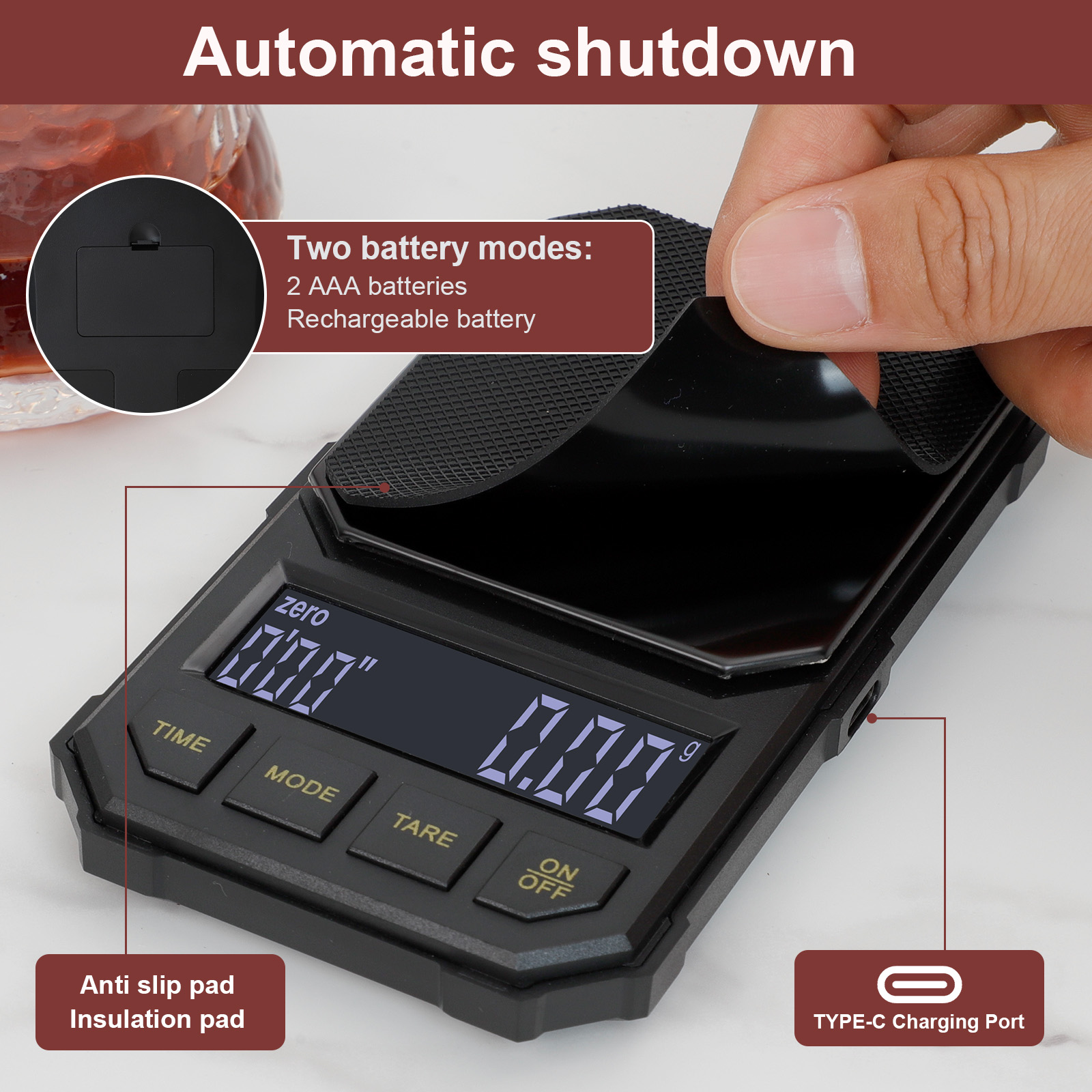 • Automatic shutdown, two battery modes: you can use two AAA batteries or use the rechargeable battery that comes with the coffee scale. The coffee scale will automatically turn off the screen when there is no activity for three consecutive minutes, and turn off automatically when there is no activity for five consecutive minutes.